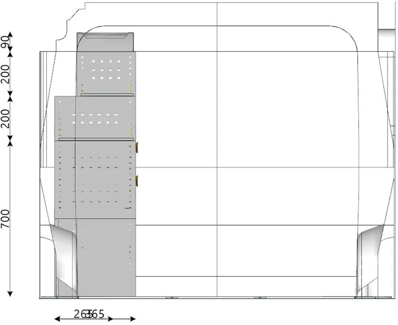 - Bauform: seitenwandangepasstes Regalmodul – der Stauraum folgt der Karosseriekontur und nutzt die Länge des Laderaums optimal aus