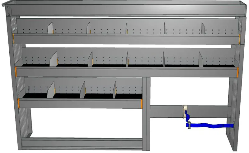 Dieses Regal ist bewusst schlicht und robust gehalten. Mit durchgehenden Ablagewannen und verstellbaren Trennblechen eignet es sich perfekt für den täglichen Einsatz in verschiedensten Gewerken – von Handwerk bis Service.