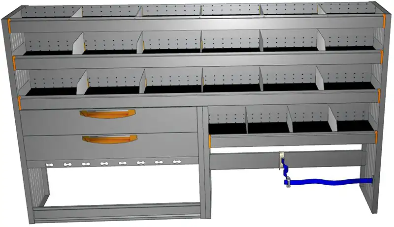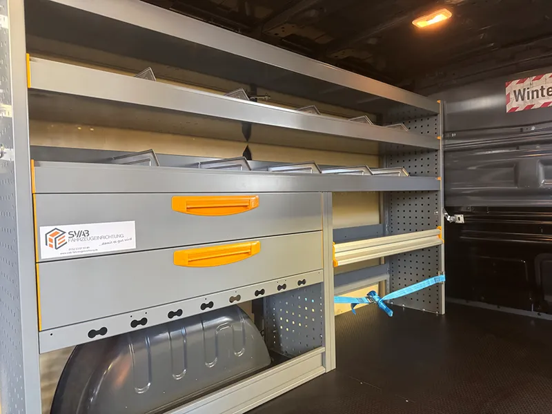 - Zusätzliche Ladungssicherung: Eine integrierte Zurrschiene unter den Schubladen sichert sperrige Gegenstände, die nicht ins Regal passen.