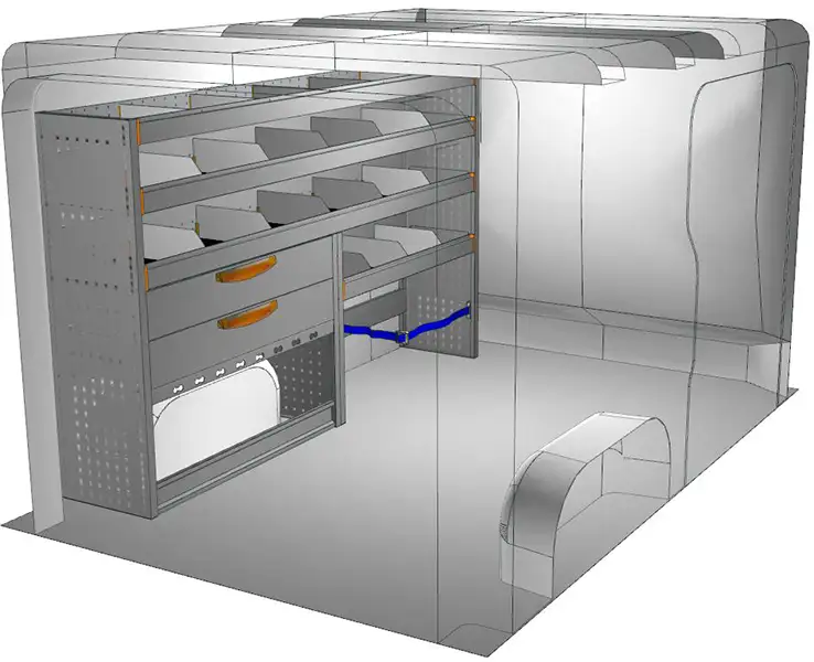 Fahrzeugeinrichtung, Fahrzeugregal Renault Trafic L1 ab Modelljahr 2014 – Modul V001, linke Seite, mit Schubladen